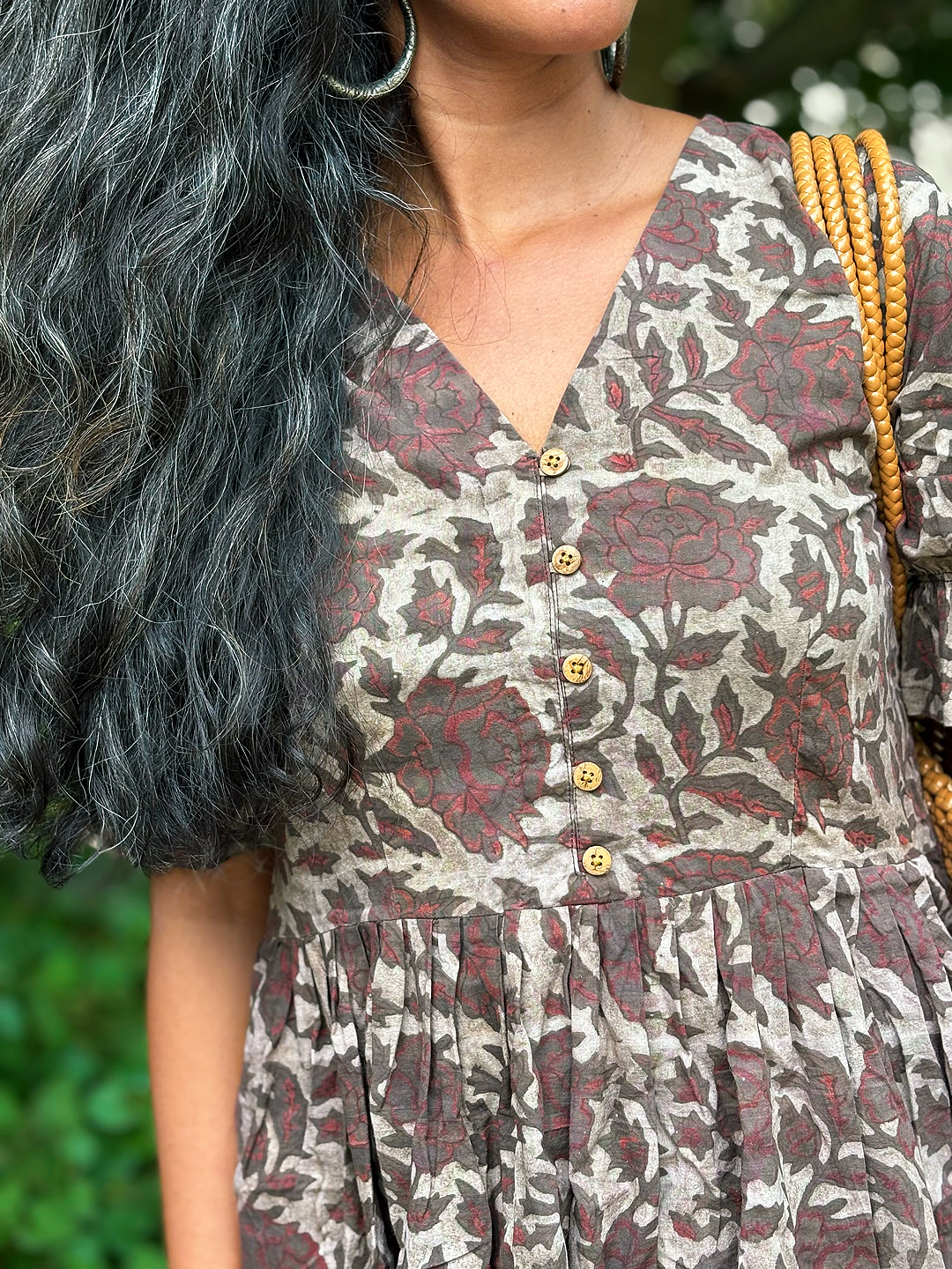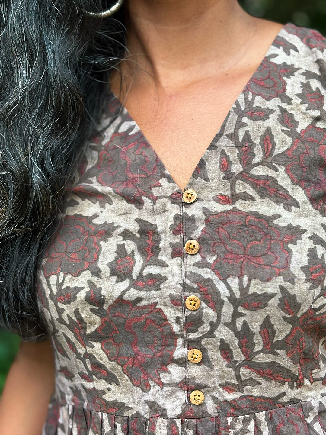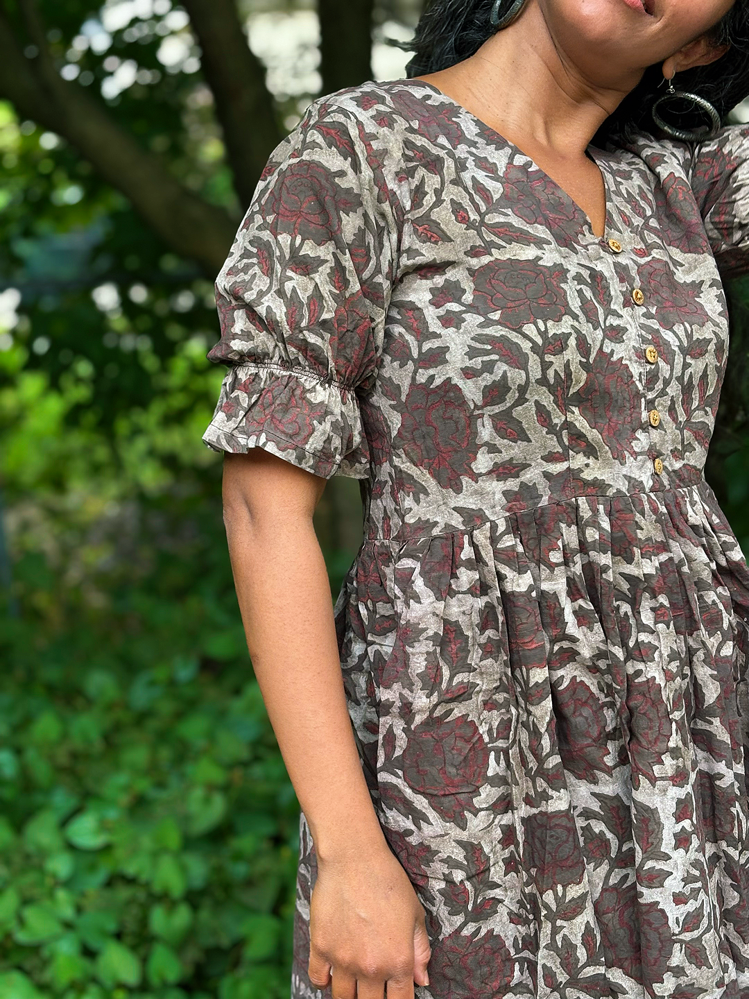 Featuring a flattering V-neckline with a row of wooden buttons, softly gathered waist, and short puff sleeves with delicate elastic detailing, this dress blends everyday comfort with heritage artistry. Its flowing silhouette makes it perfect for market strolls, picnics, or relaxed gatherings.