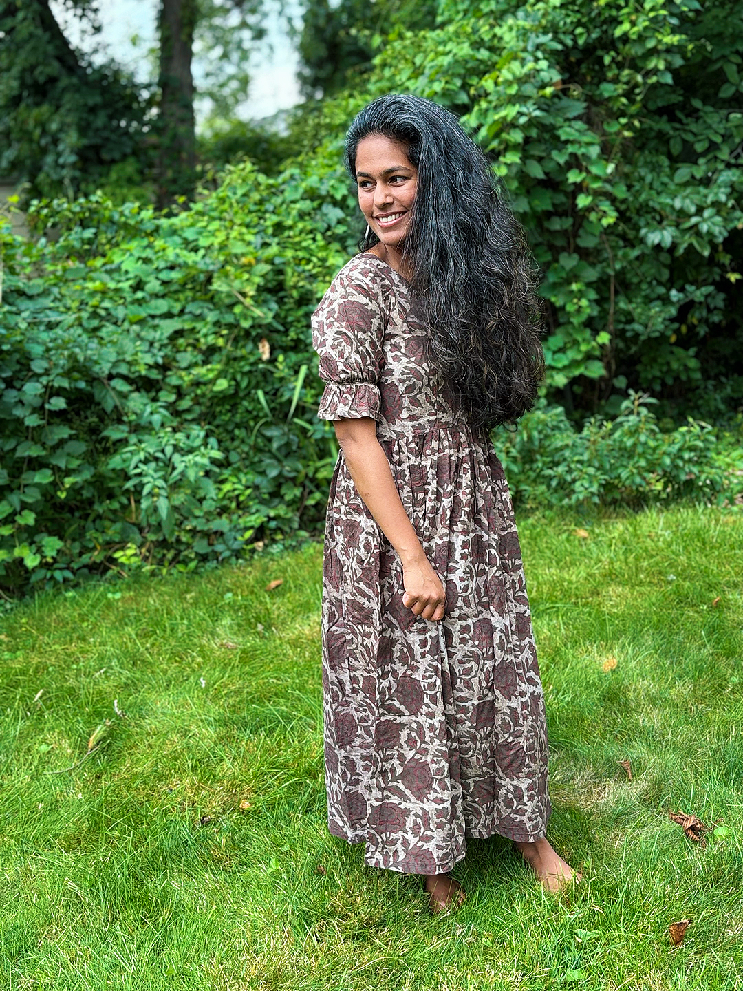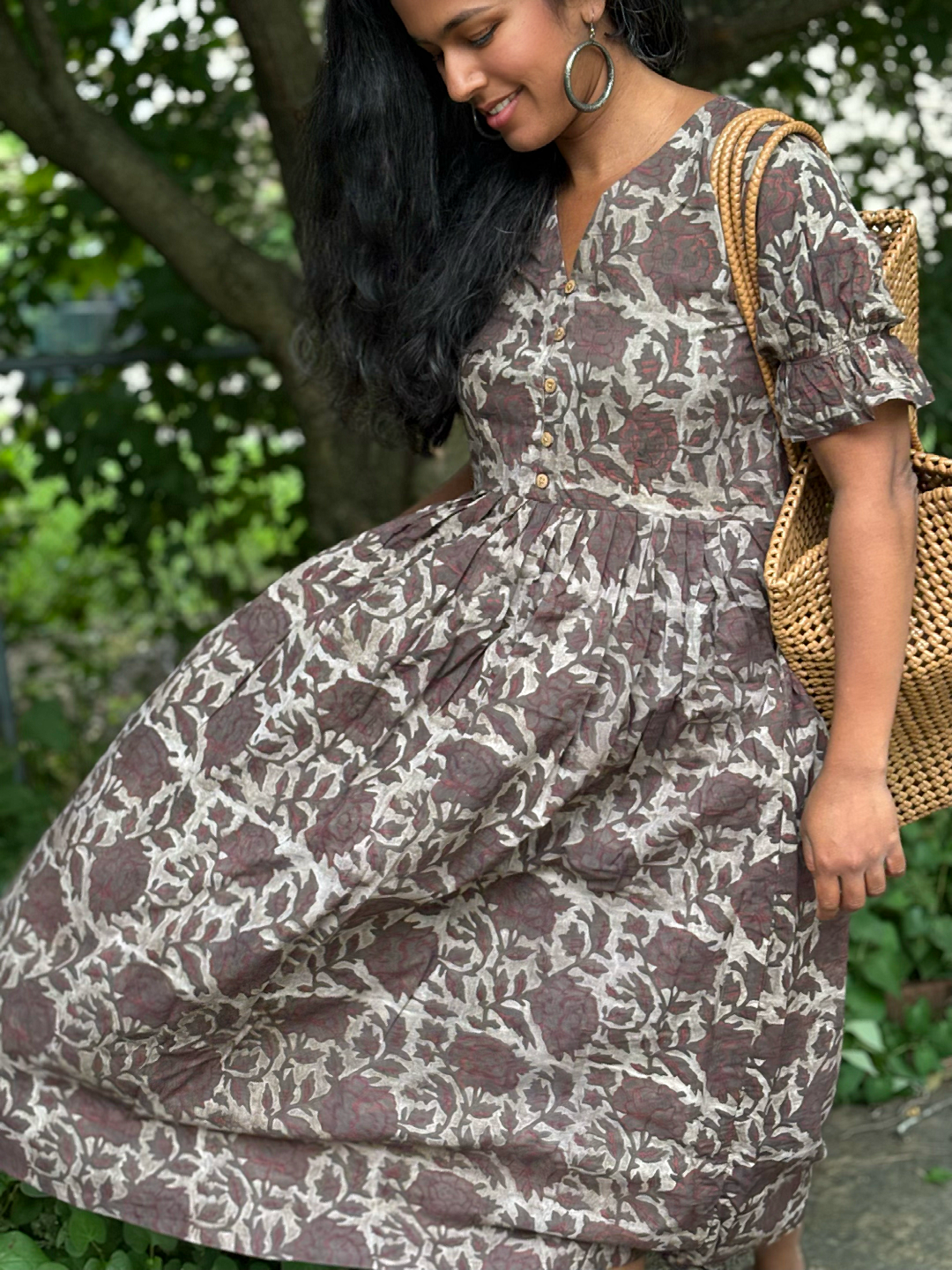 Timeless and effortlessly feminine, this hand block printed midi dress is made from 100% breathable cotton and crafted by skilled artisans in India. The earthy rose and ivory floral print is created using traditional block printing techniques, where each motif is stamped by hand with carved wooden blocks.