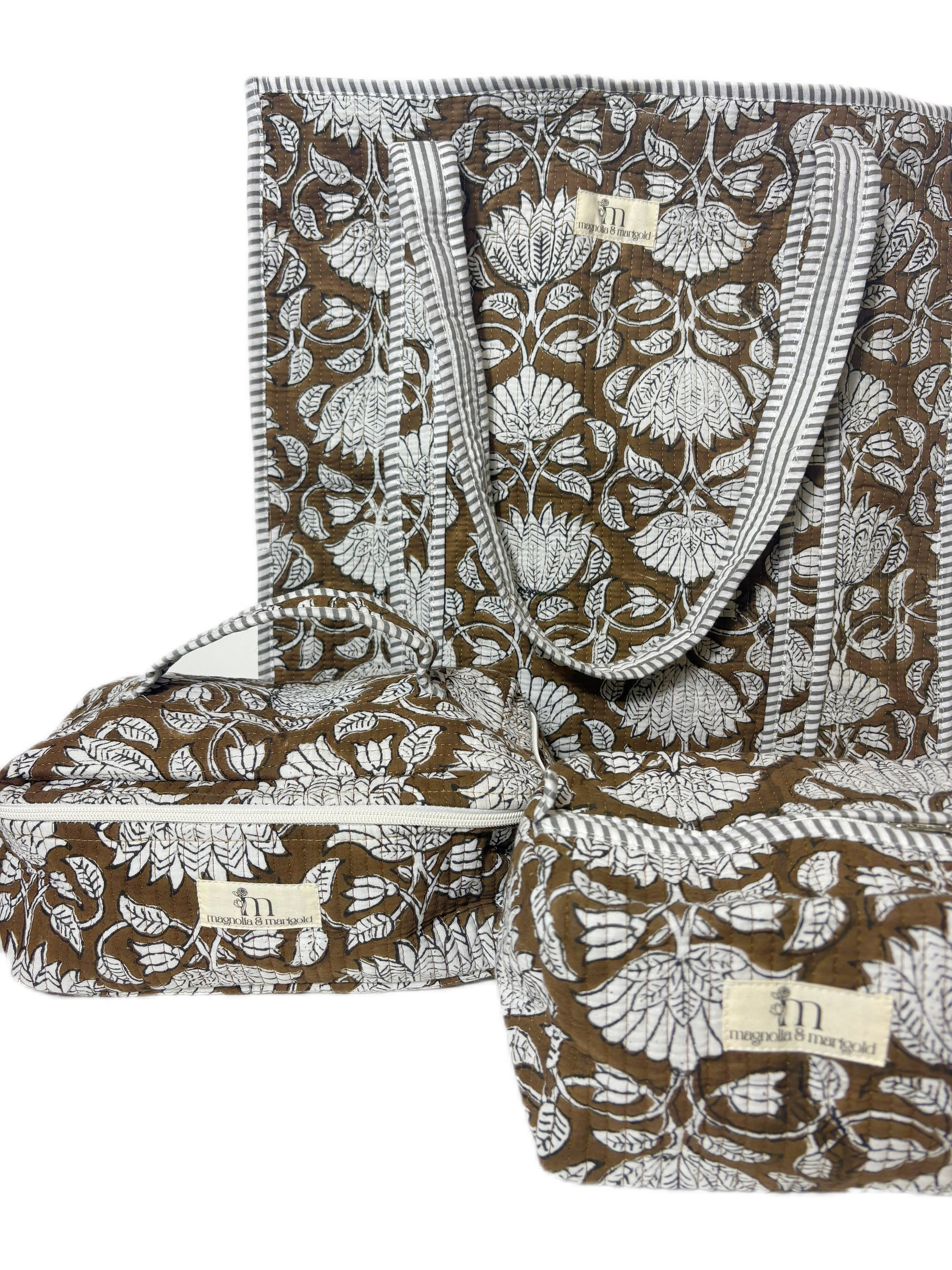 Add a touch of handcrafted charm to your everyday routine with our 3-Piece Tote Bag Set, made from 100% cotton and beautifully hand block printed by skilled artisans. Lightweight yet durable, this set includes: