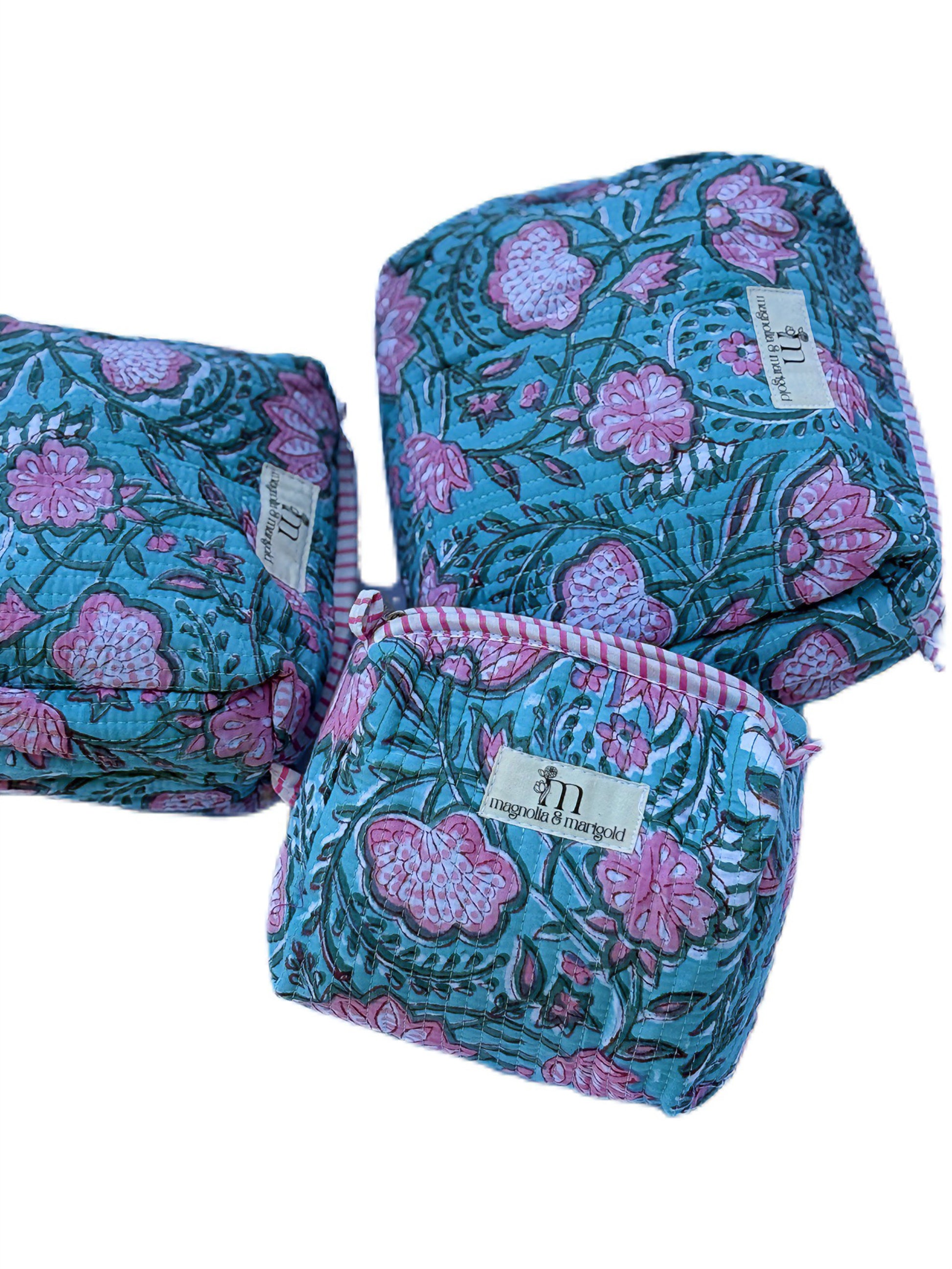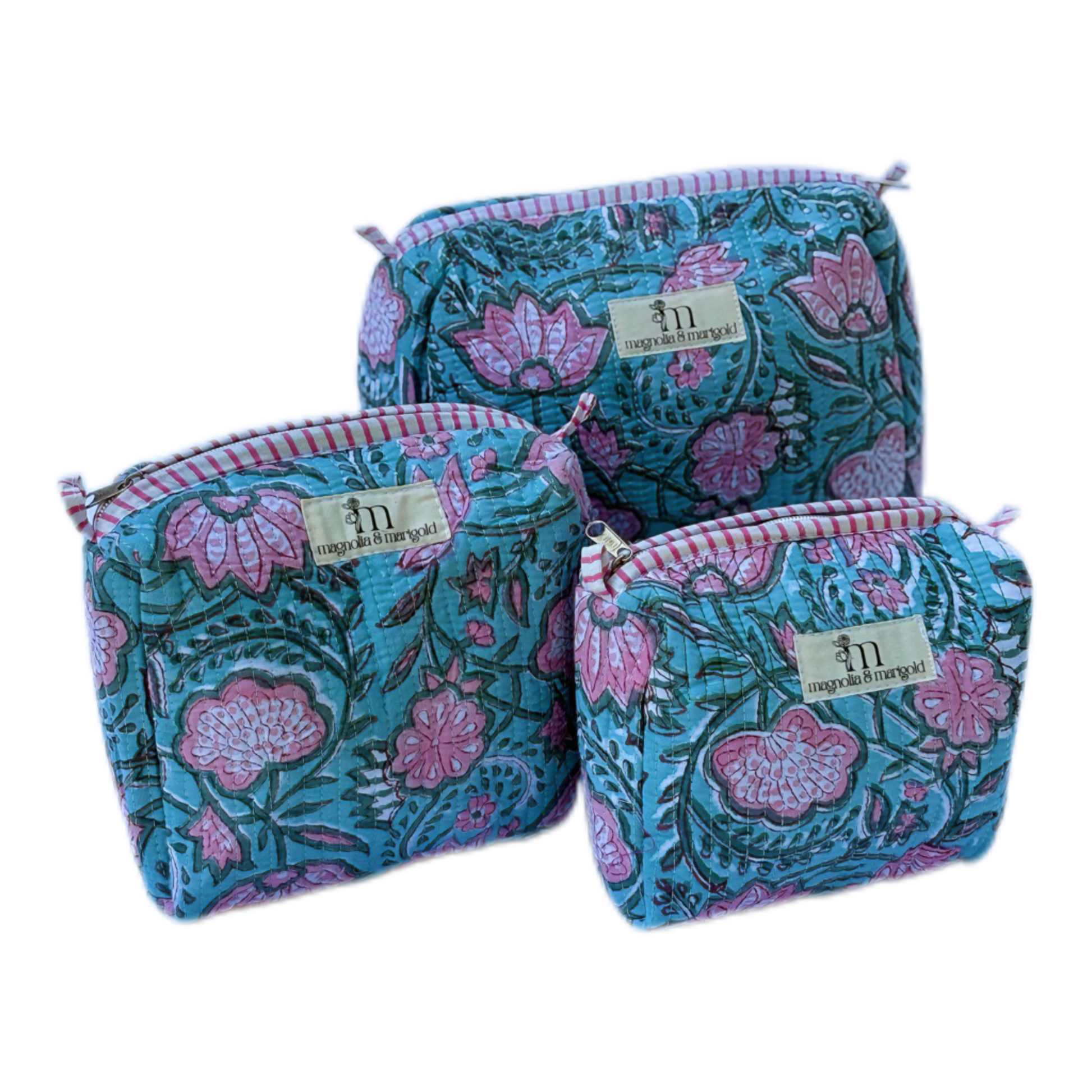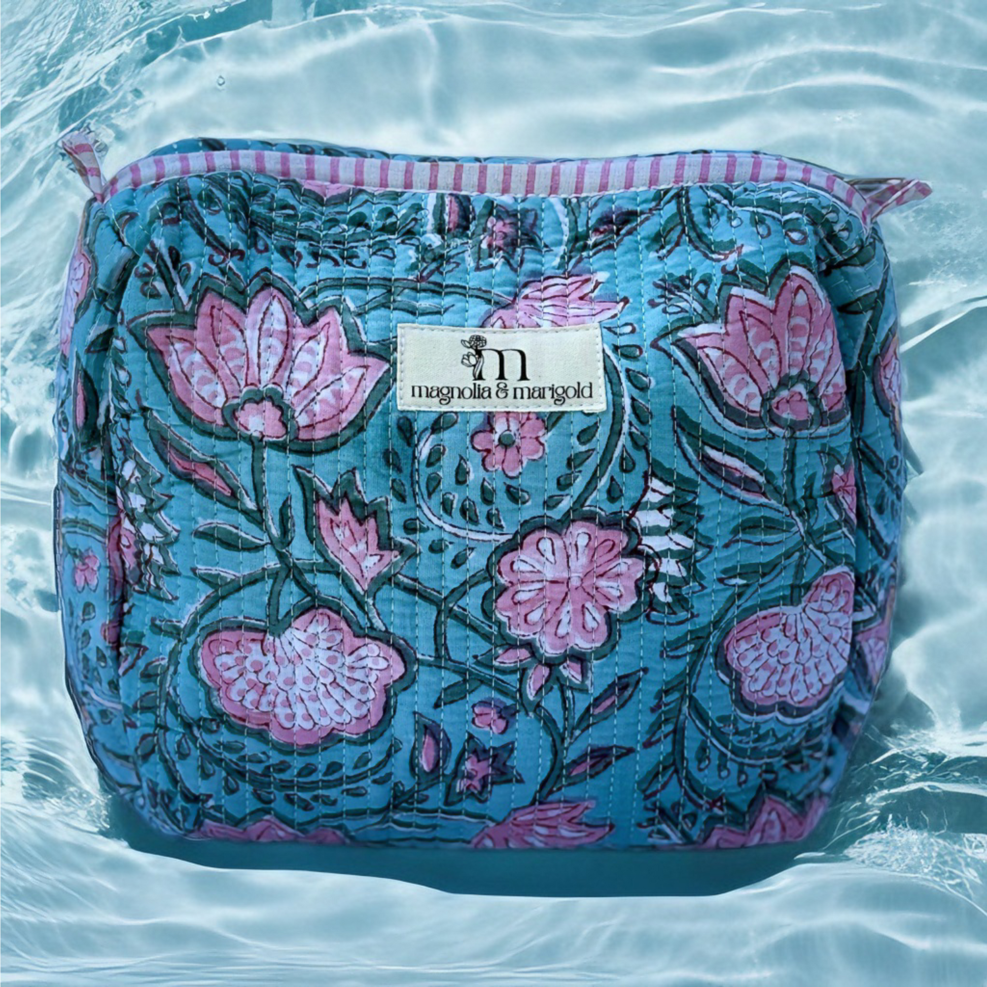 This block-printed, quilted waterproof pouch is as charming on the outside as it is functional on the inside. Designed to handle life’s little spills, it easily wipes clean-so your makeup mishaps never leave a mark.